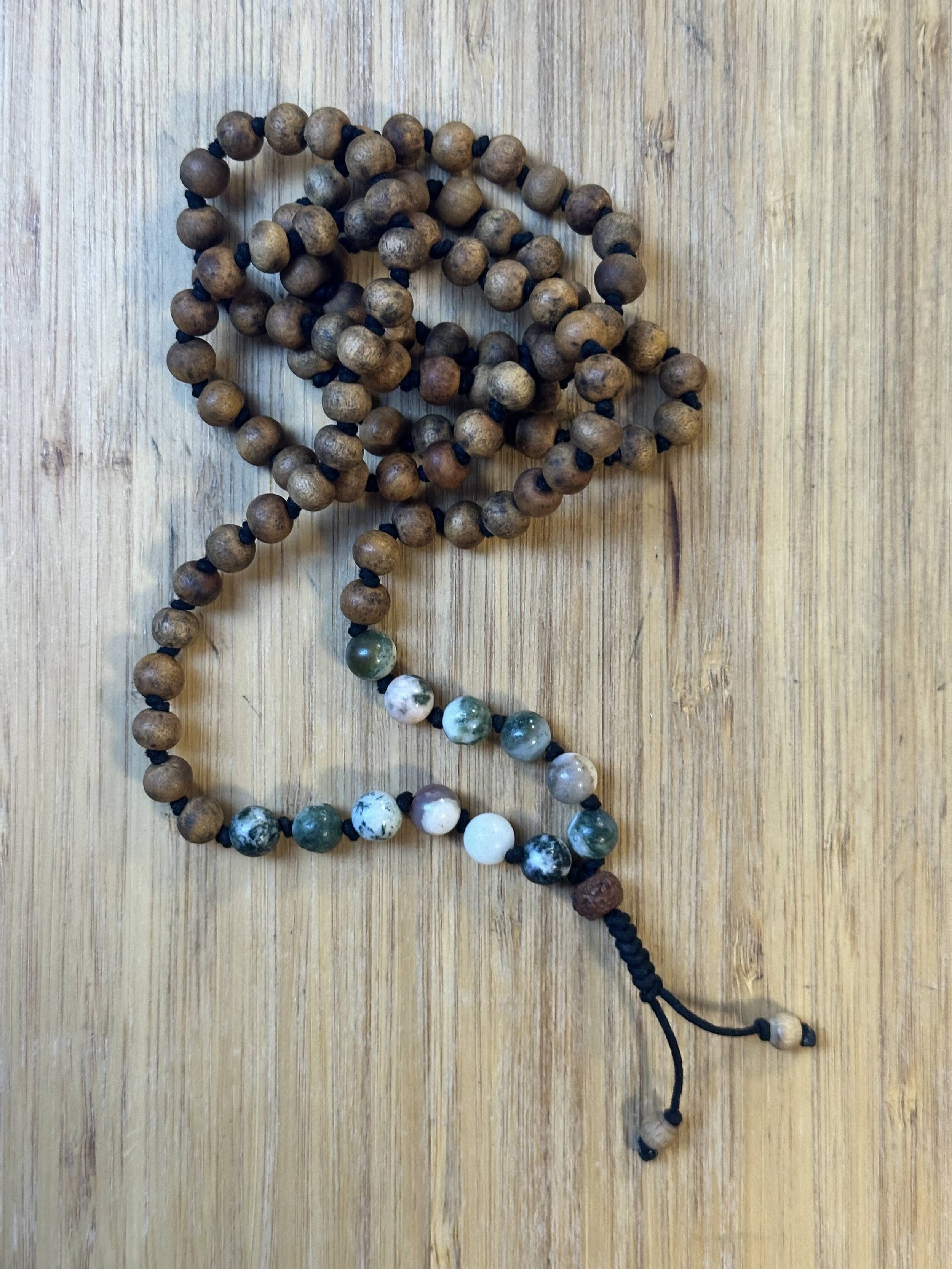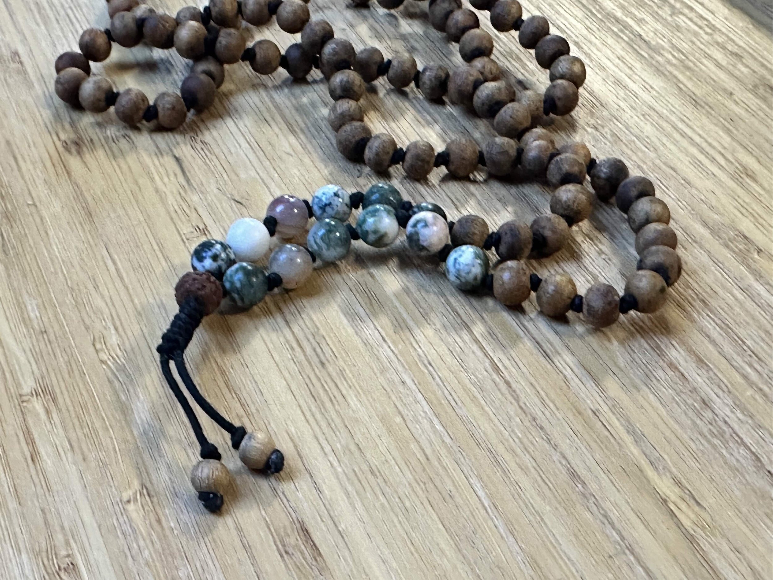 108 korálků z tulsi dřeva a mechového achátu + 1 korálek bodhi a 2 ozdobné dřevěné korálky + voskovaná bavlna + konce voskované včelím voskem