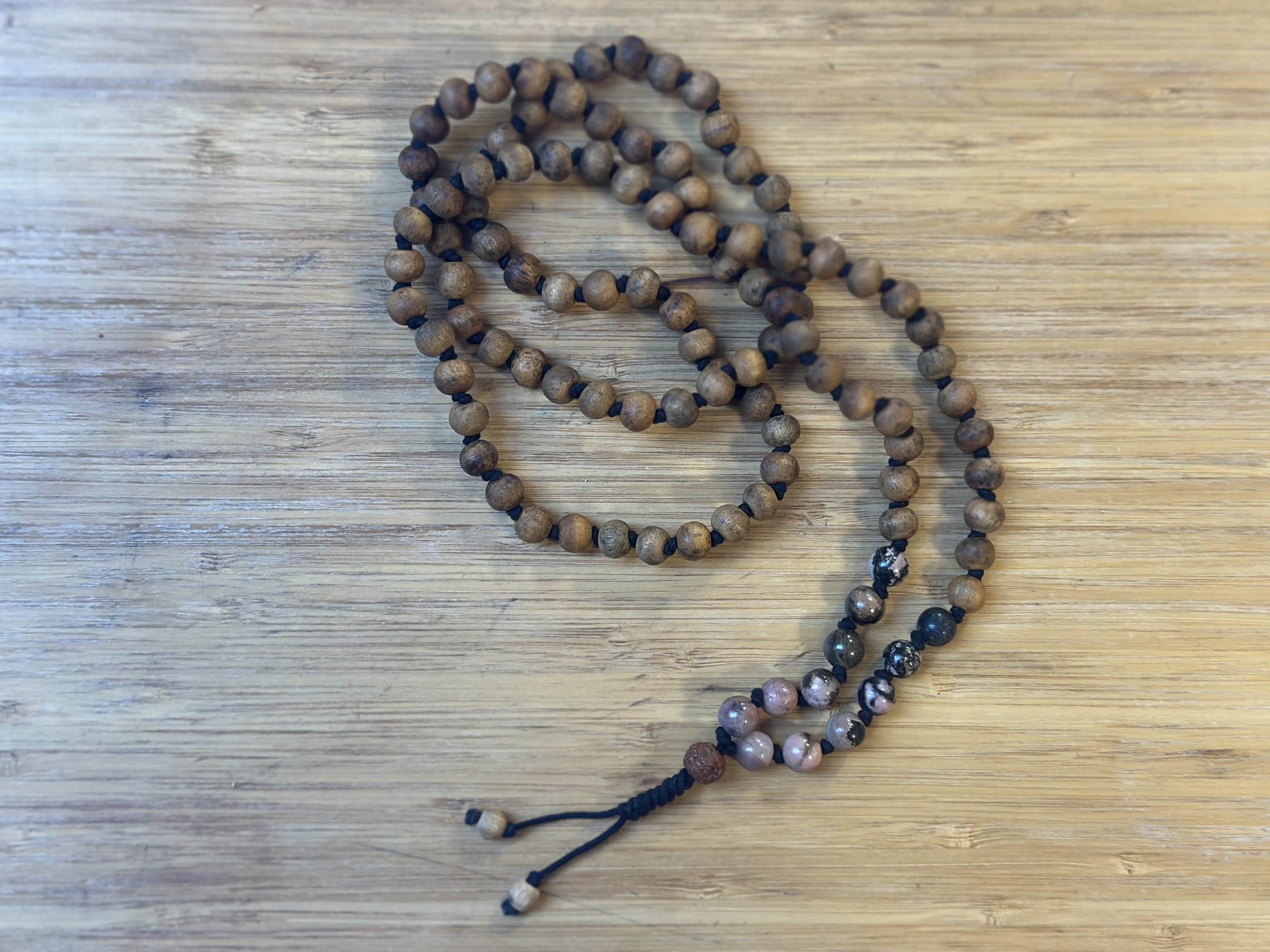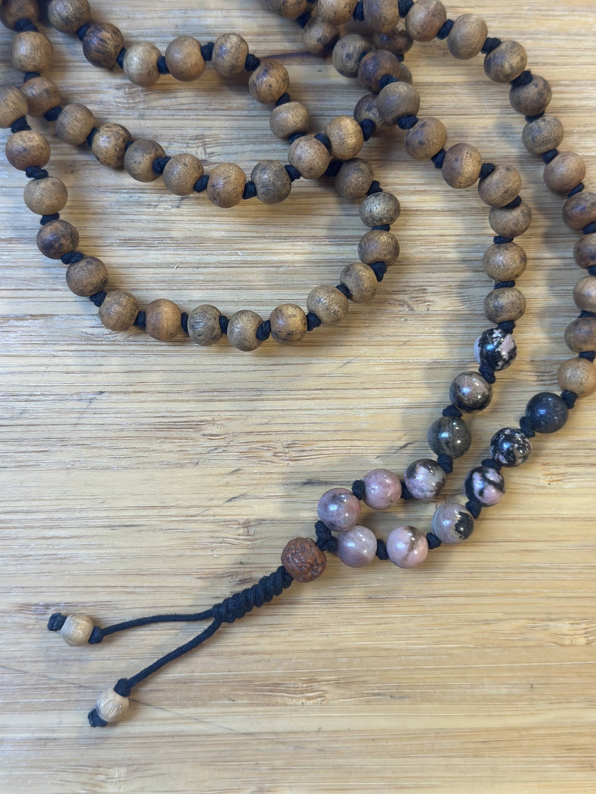 108 korálků z tulsi dřeva a rodochrozitu + 1 korálek bodhi a 2 ozdobné dřevěné korálky + voskovaná bavlna + konce voskované včelím voskem