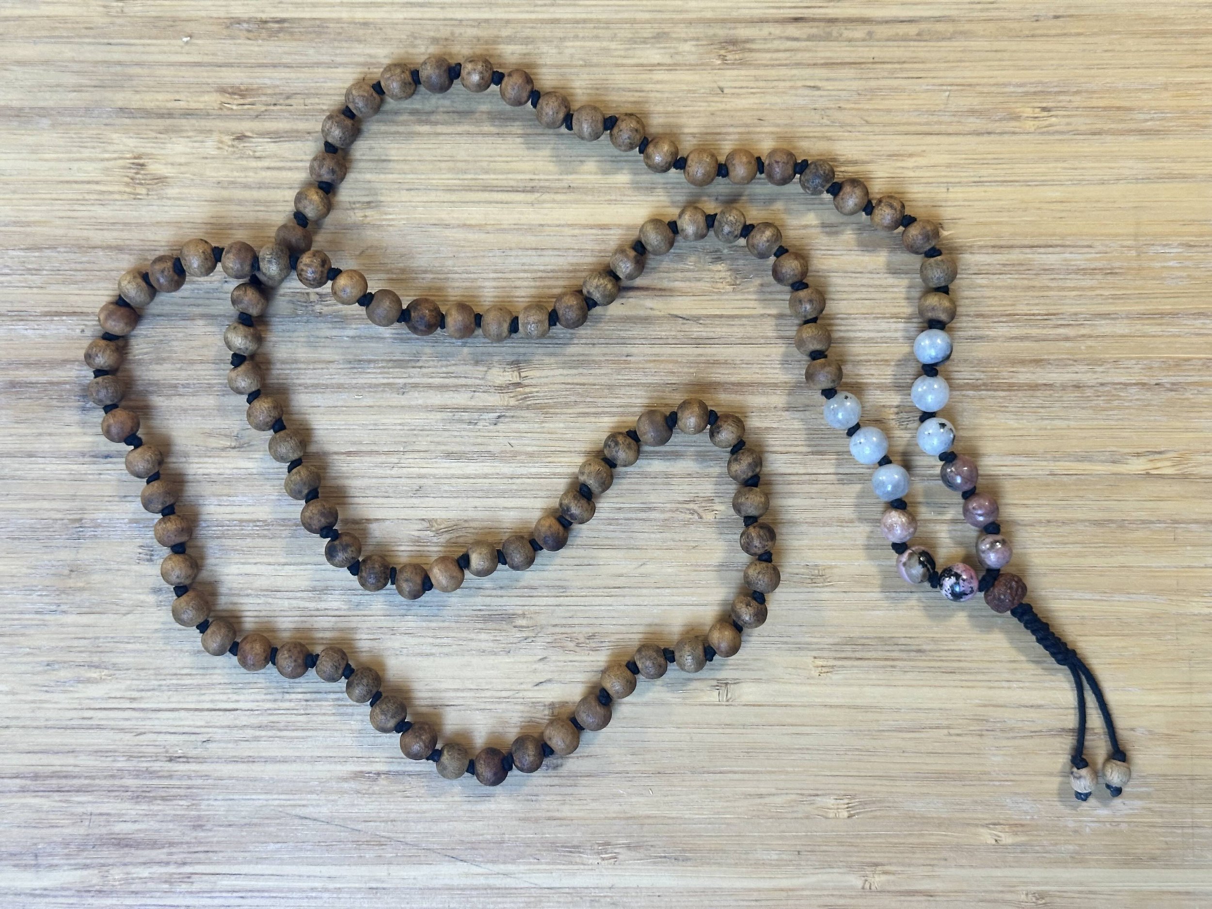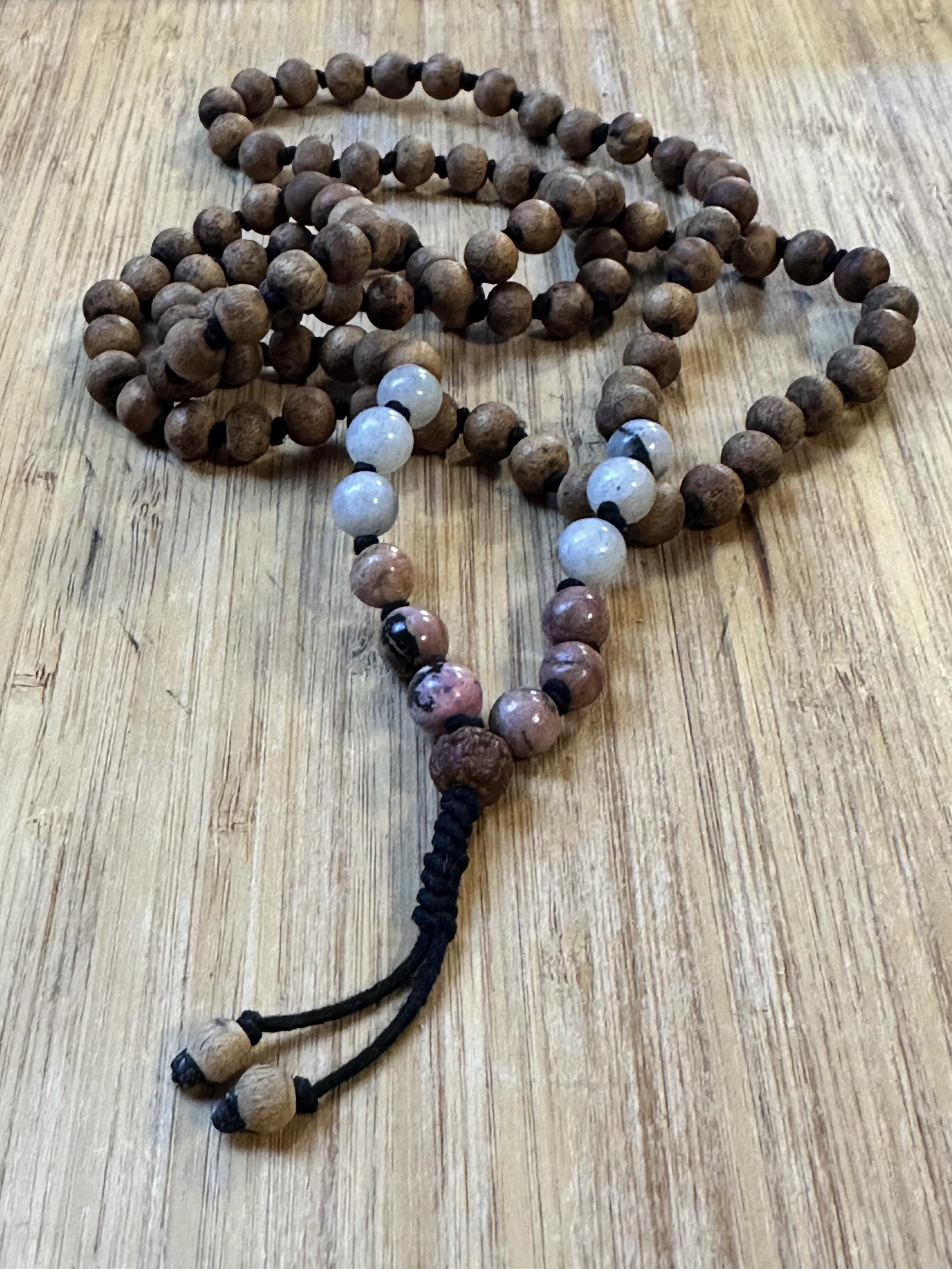 108 korálků z tulsi dřeva, rodochrozitu a duhového měsíčního kamene + 1 korálek bodhi a 2 ozdobné dřevěné korálky + voskovaná bavlna + konce voskované včelím voskem