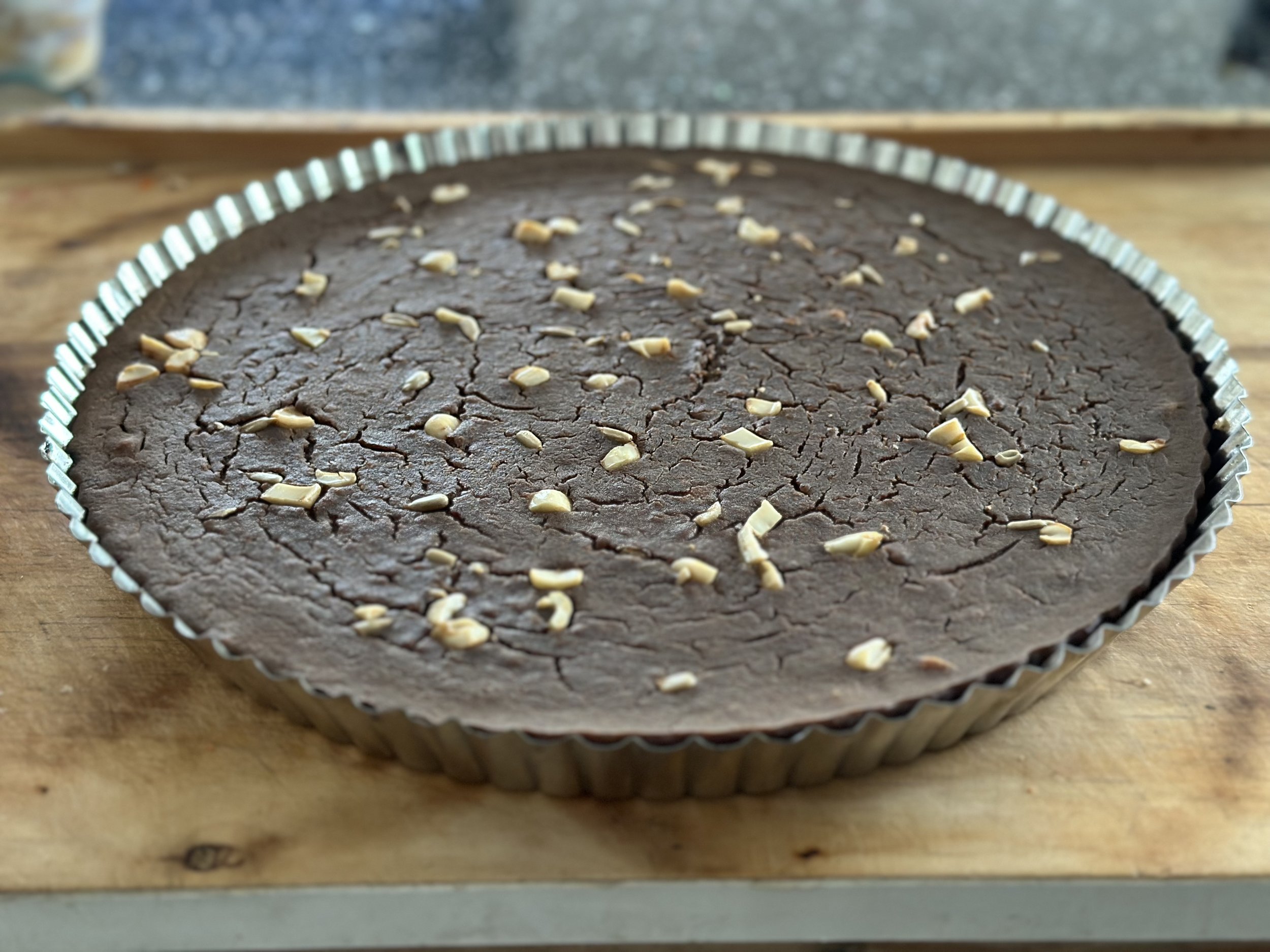 Formu lehce vymasti olivovým olejem nebo ghíčkem. Koláč by měl být málo vysoký - max 1-2cm. Péct to stačí 30-35min, ale zkontroluj to už po 25min. Nemusíš do toho rýpat špejlí, stačí se dotknout prstem uprostřed a poznáš, zda je pevný. Hotový koláč je na povrchu lehce popraskaný (viz foto níže), je pevný všude, tedy i uprostřed, a kraje jsou opečené dozlatova nebo lehce odlepené od formy.