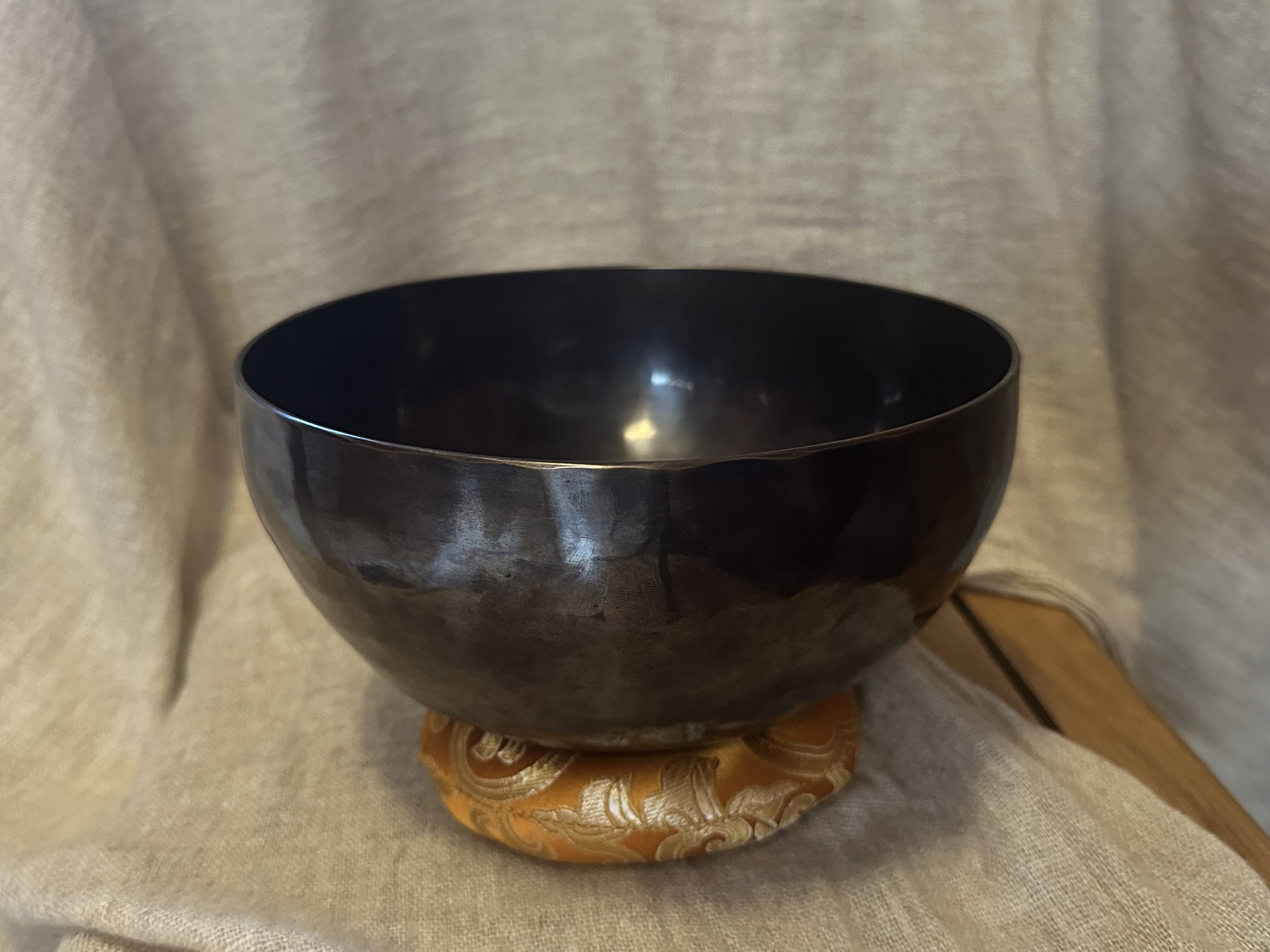 Ručně tepaná mísa z Nepálu, speciálně laděná, barvená do tmava a vysoce leštěná.