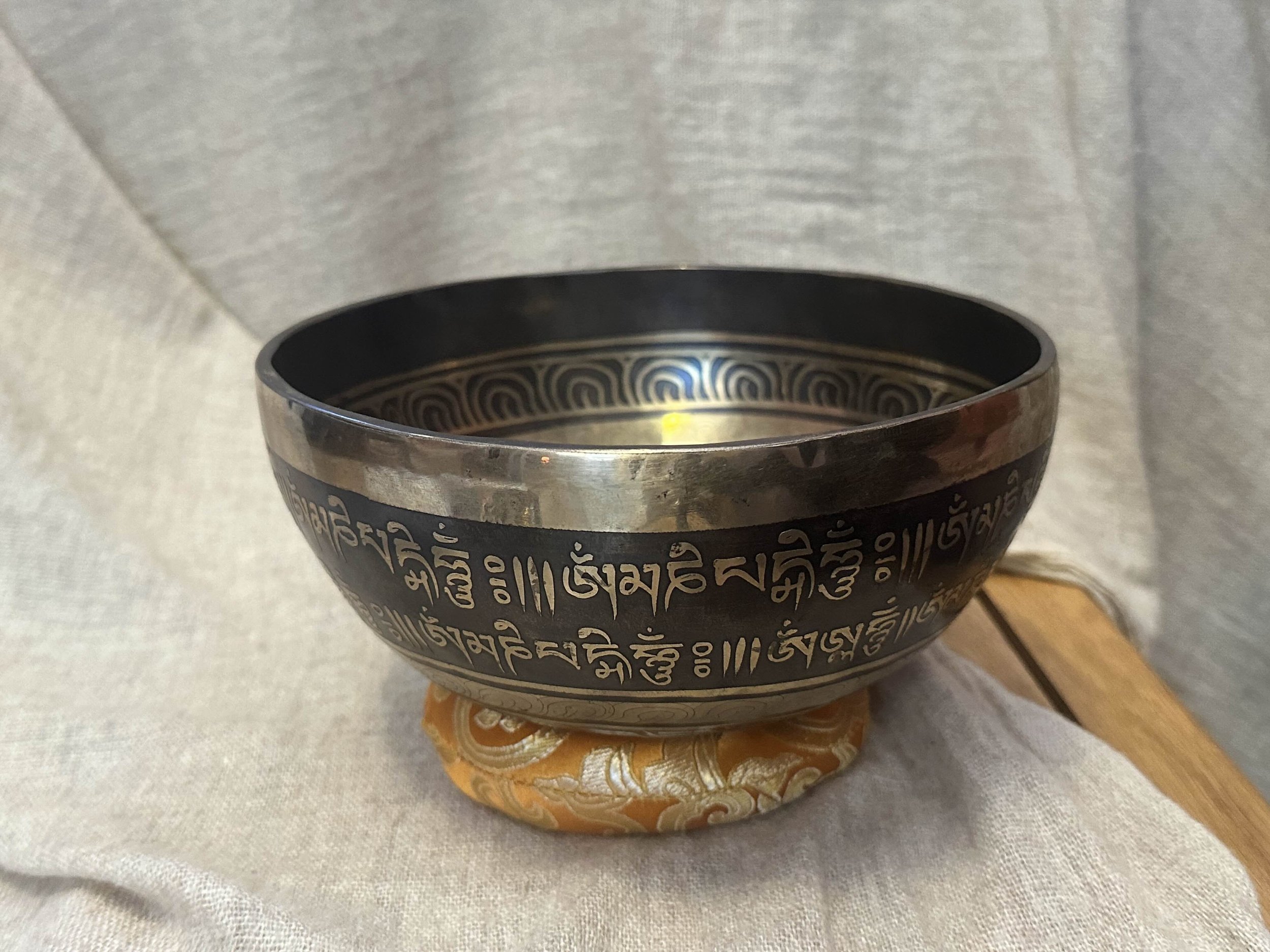 Ručně tepaná mísa z Nepálu zdobená leptanými a barvenými mantrami a ornamenty. Uvnitř jsou vyobrazeny Buddhovy oči, symbol jasného vnímání a osvícení.