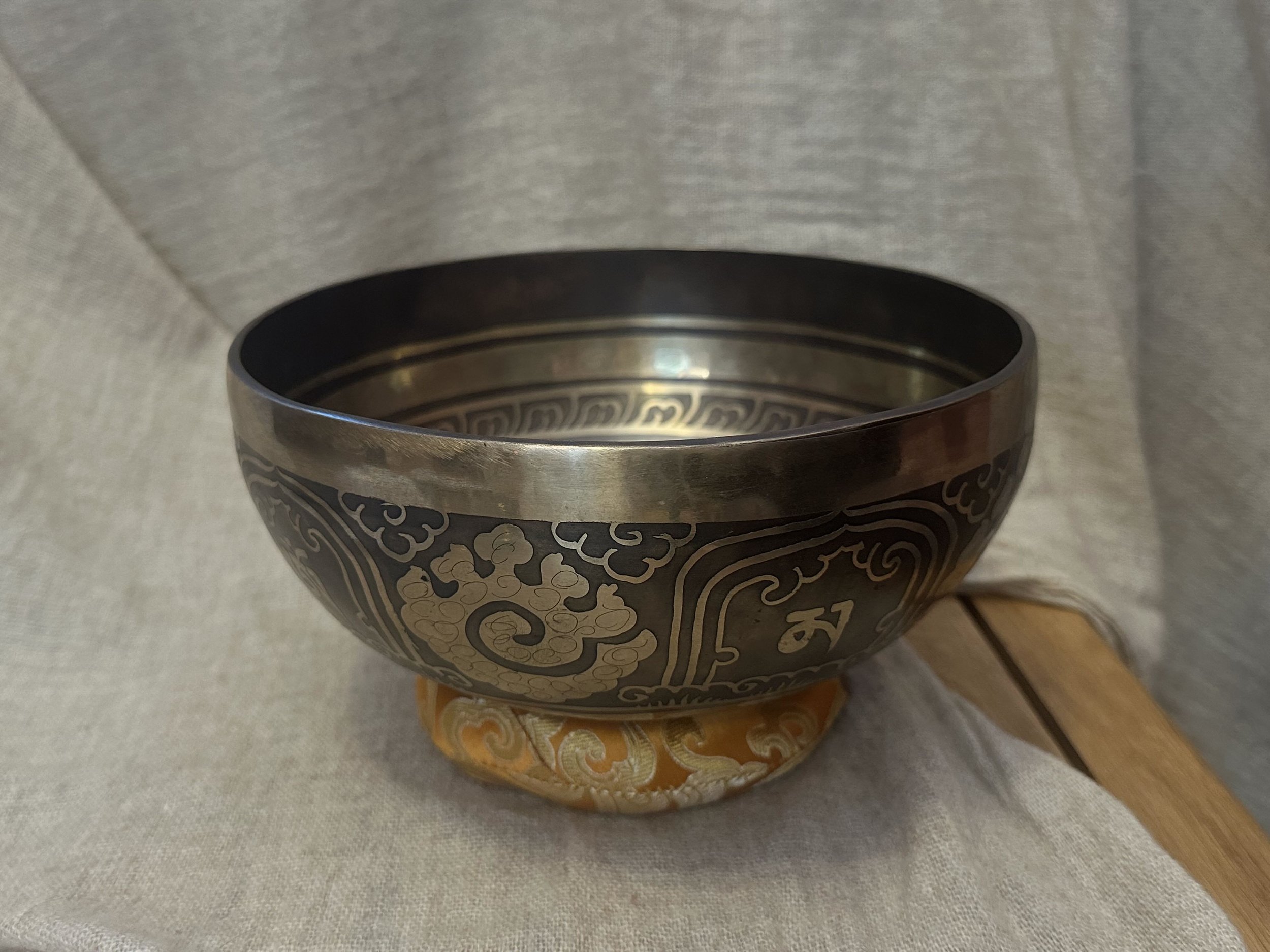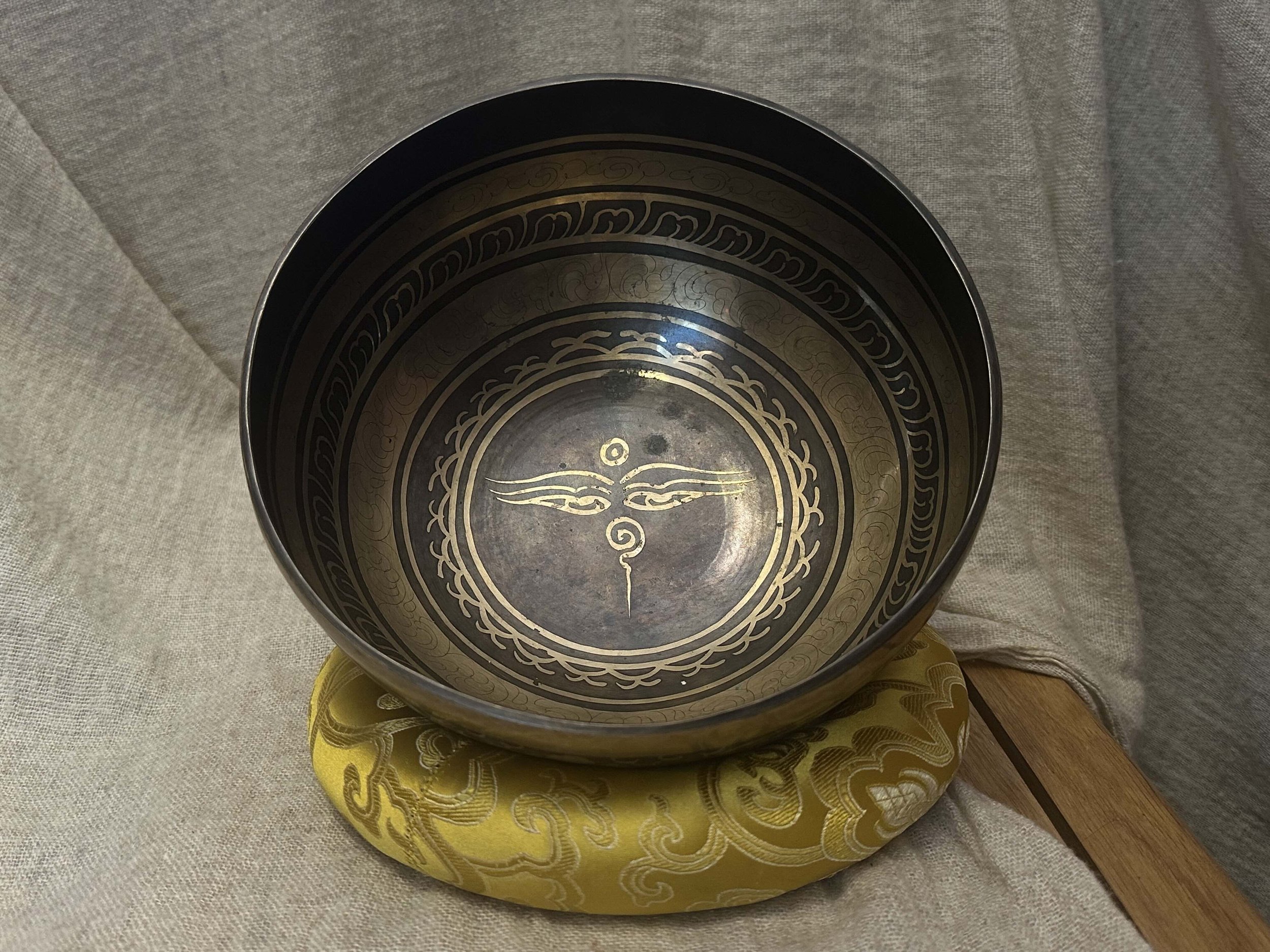 Ručně tepaná mísa z Nepálu zdobená leptanými a barvenými mantrami a ornamenty. Uvnitř jsou vyobrazeny Buddhovy oči, symbol jasného vnímání a osvícení.