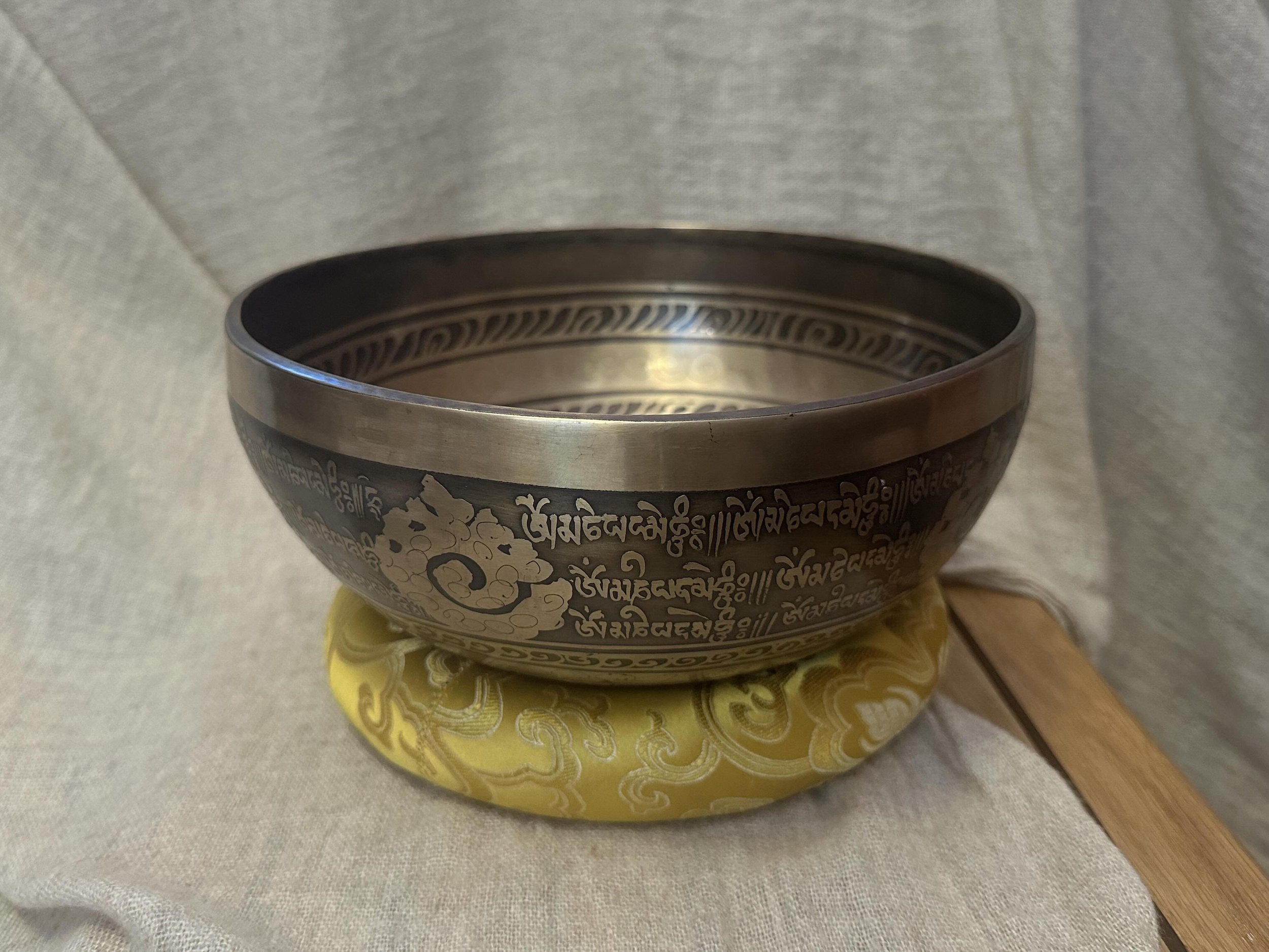 Ručně tepaná mísa z Nepálu zdobená leptanými a barvenými mantrami a ornamenty. Uvnitř je vyobrazen Medicine Buddha, symbol osvícení a léčení.
