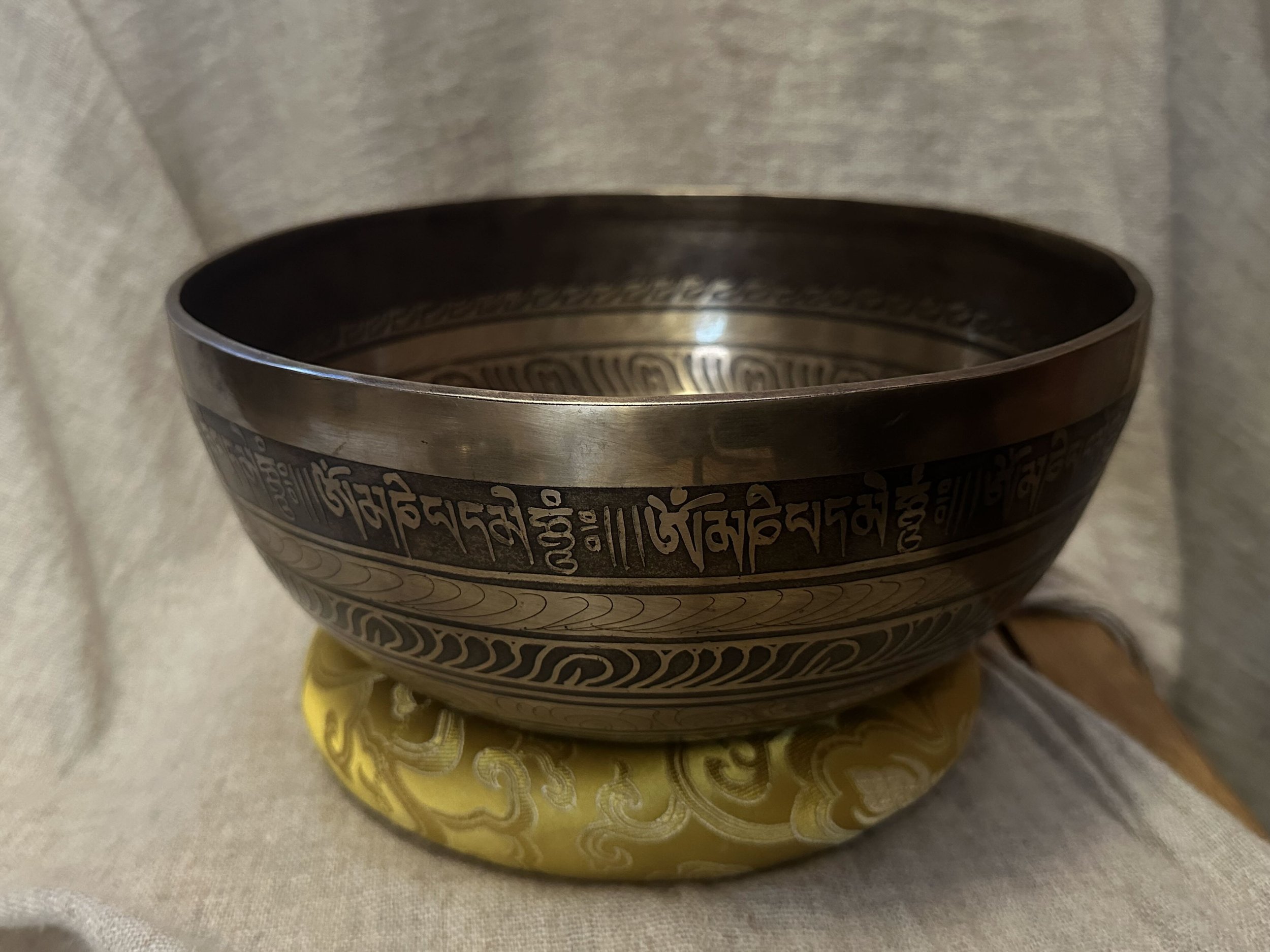 Ručně tepaná mísa z Nepálu zdobená leptanými a barvenými mantrami a ornamenty. Uvnitř je vyobrazen symbol Sahasrary, tedy korunové čakry, osvícení, jednoty a spojení s vesmírem.